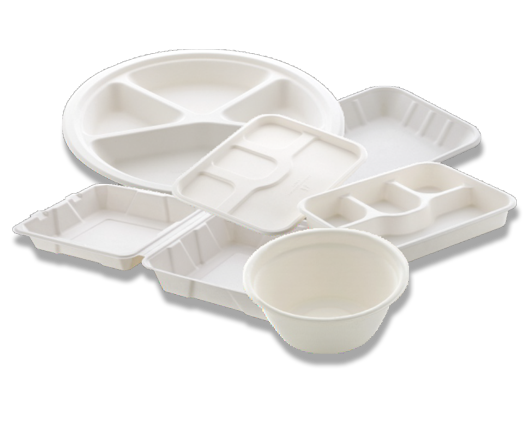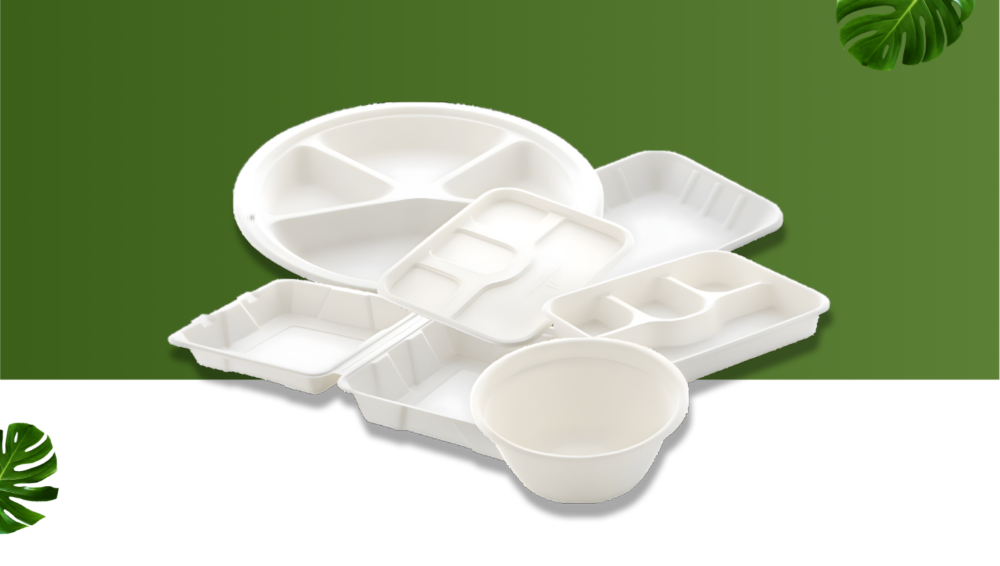 Eco-friendly disposable tableware made from renewable resources like bagasse and areca leaves.